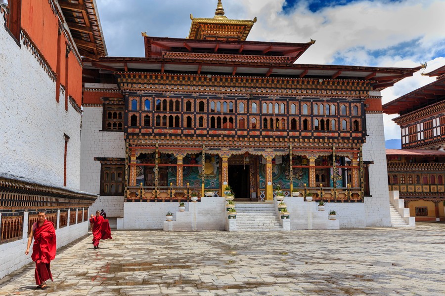 Az első belső udvaron egy sztúpa, és egy bodhi fa áll, itt szokták tartani évente azokat a maszkos táncünnepeket, amikkel a démonok legyőzését és a buddhizmus térhódítását ünneplik. A hátsó udvarba keskeny folyosó vezet. Innen nyílik az a helység, ahol Sebdrung hamvait őrzik, és innen nyílik az a templom is, ami még ma is fontos döntések színtere. A trón székek a királyt és a legfőbb lámát illetik. A sötét terem mennyezetét hatalmas, domborművekkel díszített rézlemezek borítják. Itt is hatalmas Buddha szobrok uralják a teret, melyek a múltról és a jövőről mesélnek a beavatott szemek számára.