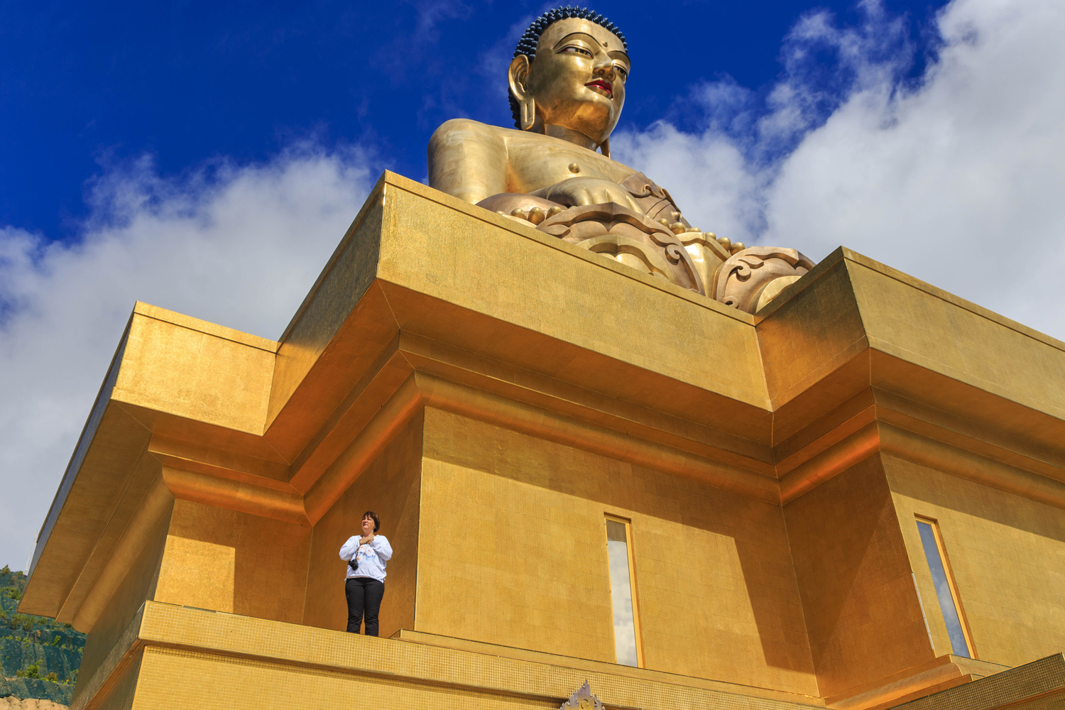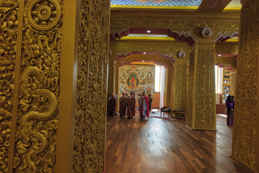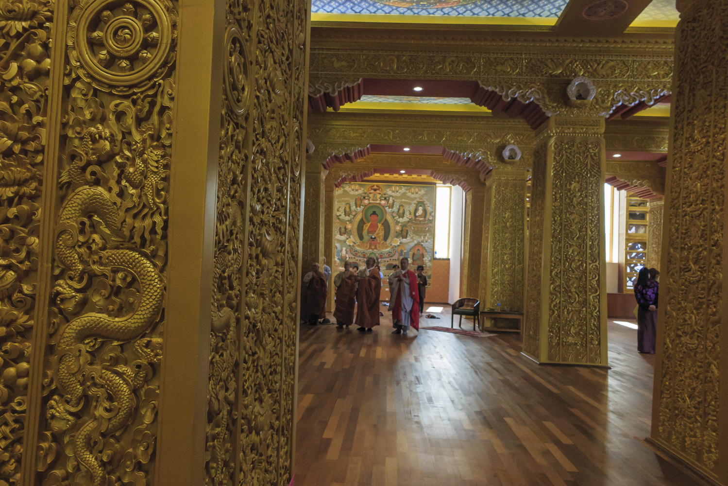 Először a város fölé épített, pontosabban épülő óriási Buddha szoborhoz kapaszkodtunk föl a meredek, szerpentines úton. Az 51 méter magas aranyszínű szobrot úgy helyezték el, hogy a városból, profilból lehessen látni. Előtte hatalmas kőburkolatú térség, melynek vége szinte lebeg a mélység fölött. A talapzata kétszintes, amiben hatalmas imatermet alakítottak ki. A talapzat körül finoman kidolgozott női angyalok sorakoznak, melyek különféle felajánlásokat tartanak a kezükben. A világos imaterem központi szobra természetesen egy ülő Buddha, amelyet hat, felé forduló, álló Buddha vesz körül. A falakon mennyezetig érő polcok, amelyeken kisebb Buddha szobrok állnak, vagy lesznek. A falakon készülő, vagy kész festmények. Kívül-belül az arany a domináló szín.