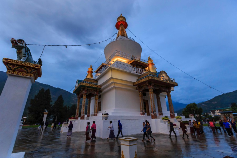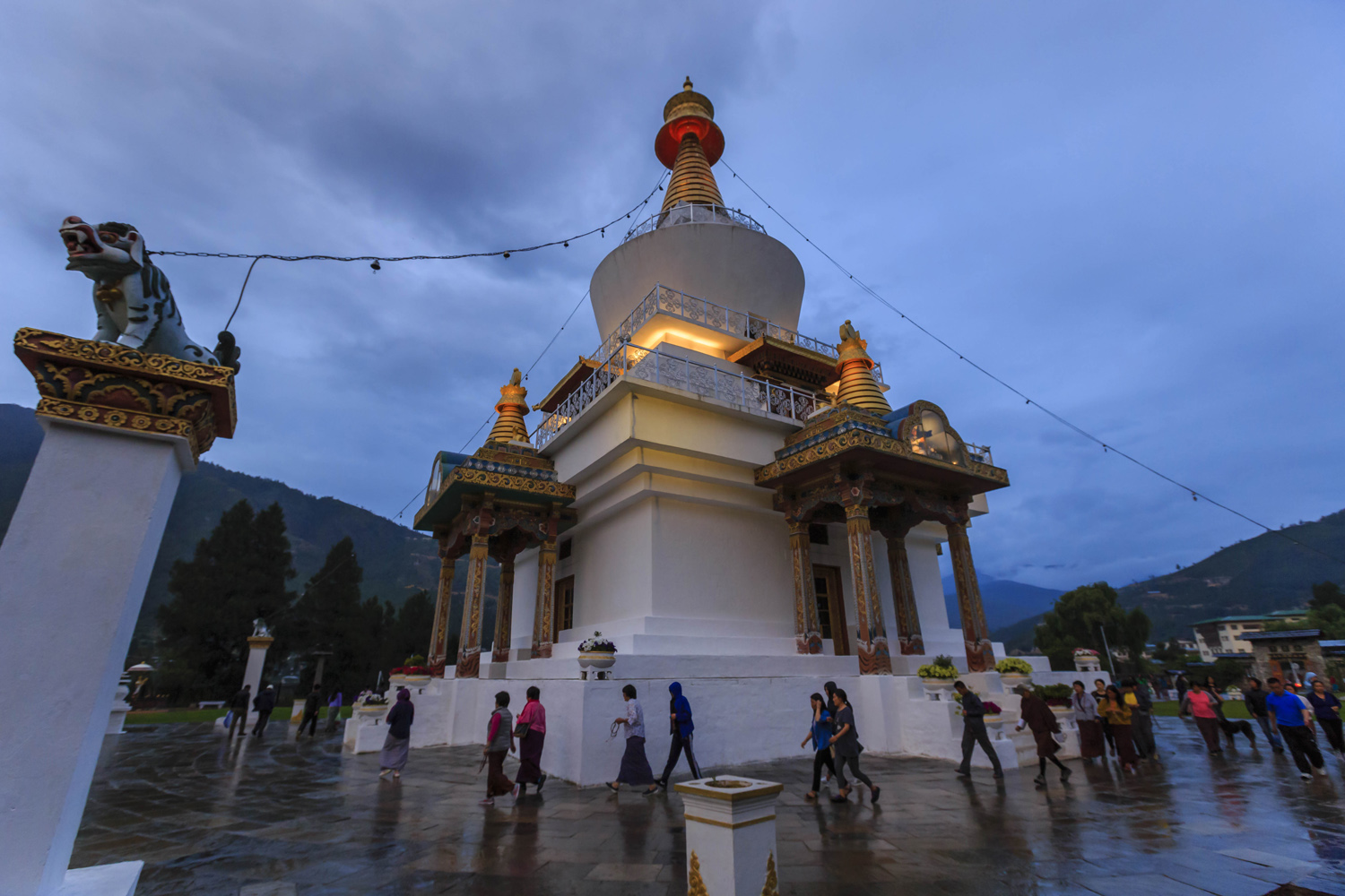 Két folyó találkozásánál, egy híd utáni ellenőrzőpont következett. Ilyenek itt is vannak, de ezeknek az a feladata, hogy az illegális bevándorlást megakadályozzák. A meredek oldalú hegyekkel kísért folyóvölgyben továbbhaladva hamarosan beértünk a fővárosba, Thimphuba. Először megtekintettük, és körbesétáltuk a Nemzeti Emlék Sztúpát, amit a harmadik király felesége emeltetett férje emlékére. A csöpörgő eső ellenére sok hívő rótta köreit mély áhítattal.