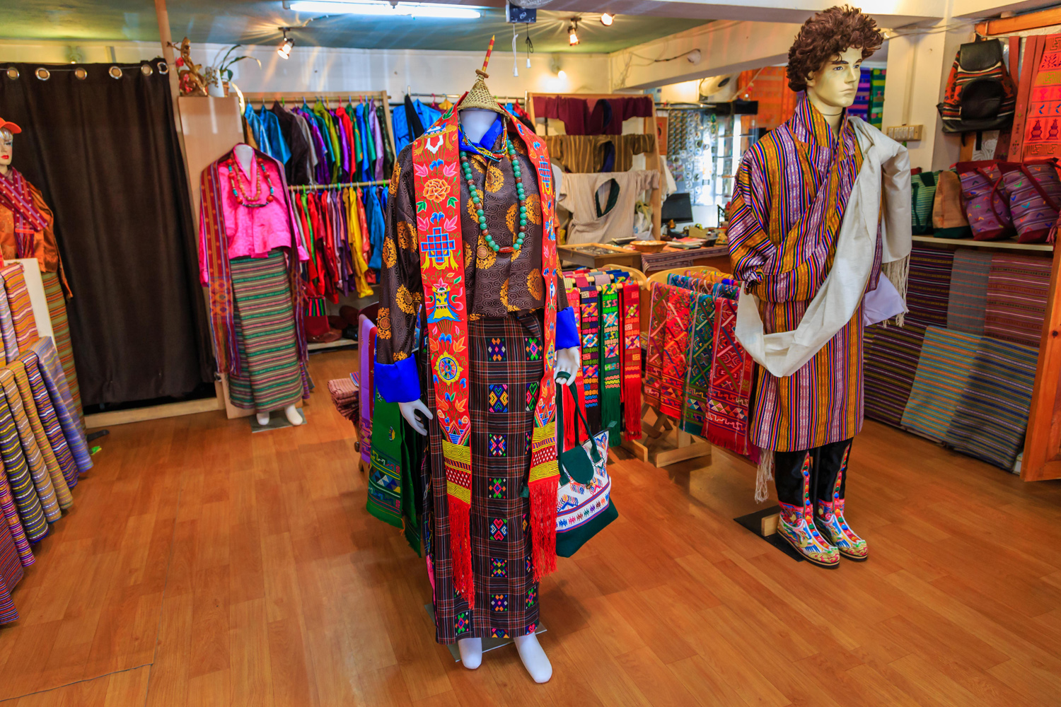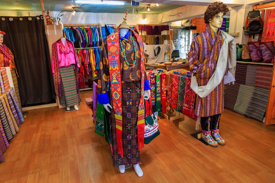 Ezután átmentünk egy kézműves műhelybe, amelyben a régi típusú szövőszékeken aprólékos munkával, szorgos kezek által készülnek a hagyományos anyagú és mintájú szövetek. A z emeleti boltban ámulattal néztük a szebbnél szebb anyagokat, illetve készárukat. Itt árulták a már említett gho-kat és kirákat, de a legjobban a különleges formájú, hímzett csizmák tetszettek, amiket például a király teljesalakos képein lehet látni.