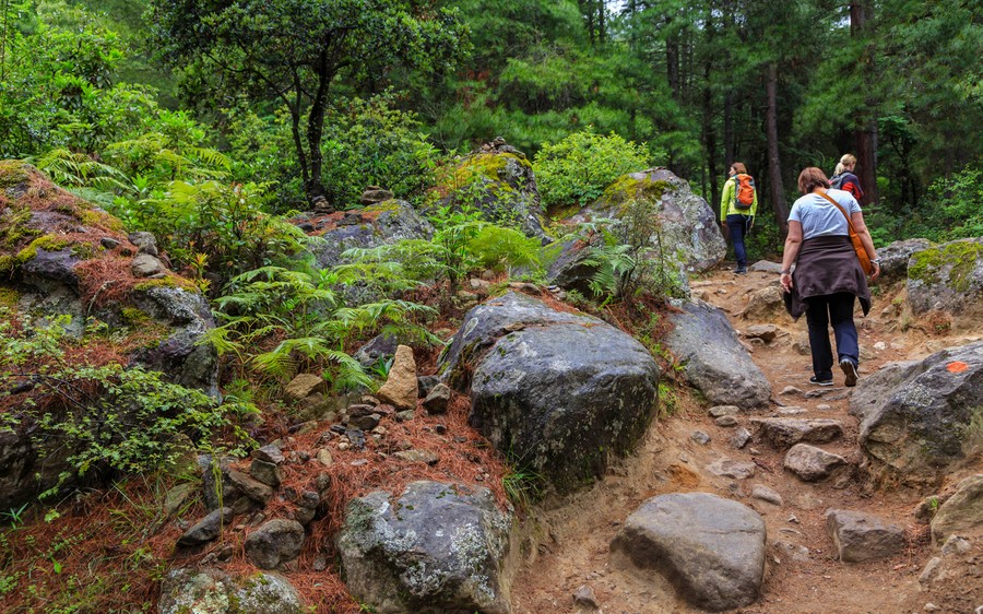Gyümölcsökkel megrakodva nekivágtunk a hegyvidéknek. Az út meredeken, kanyarogva vezetett a felhők közé. A növényzet egyre dúsabb, zöldebb lett, a fák mérete megnőtt, és megjelentek a fák ágain és törzsén élő epifitonok (rajtaélők), a broméliák és orchideák. Köderdőben jártunk. A burjánzó növényzet az állandóan magas páratartalmú levegőből jut megfelelő csapadékmennyiséghez. Az erdő bujaságára jellemző, hogy a csak Bhutanban megtalálható orchideák száma kétszáz fölött van. Miközben kapaszkodtunk, az jutott eszembe, hogy az útépítő mérnökök vonalzója elveszhetett, mert csak körzővel rajzolták meg az útvonalat. Nem volt egyetlen méter egyenes szakasz sem.