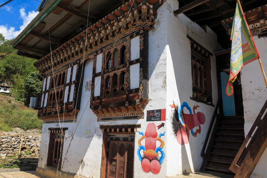 Viszonylag késői reggeli után elindultunk egy kolostor felé. A Punakha külvárosának számító apró házak közt keltünk útra. A házakon mindenütt ott voltak a fentebb említett óvó jelképek. Ezeken kívül mindenféle megjelenésben ott pompáztak a Bhutánra oly jellemző férfi nemi szerv ábrázolások. Ebből is a legjellegzetesebb az, amikor szalaggal díszítve örökítik meg. A története az őrült, tibeti származású szerzeteshez, Drupka Qnley-hez köthető. Történt egyszer, hogy meg akarta látogatni a Punakhadzongot, de nem akarták beengedni. Volt nála egy aranyrög, amit beküldetett a lámának ajándékként. Így már fogadták, és megajándékozták egy sállal, amit semmiképp nem tudott elhelyezni magán. Tette ide, tette oda, de sehogy sem tetszett neki. Végül is az jutott eszébe, felköti legnemesebb testrészére. Innen a felfestett dísz legendája. A láma egyébként létező személy volt, és Buddha tanításaiból az élvezd az élet kezdetűt követte. Szerette a lányokat és a jó ételeket, meg még egy kicsit a lányokat.