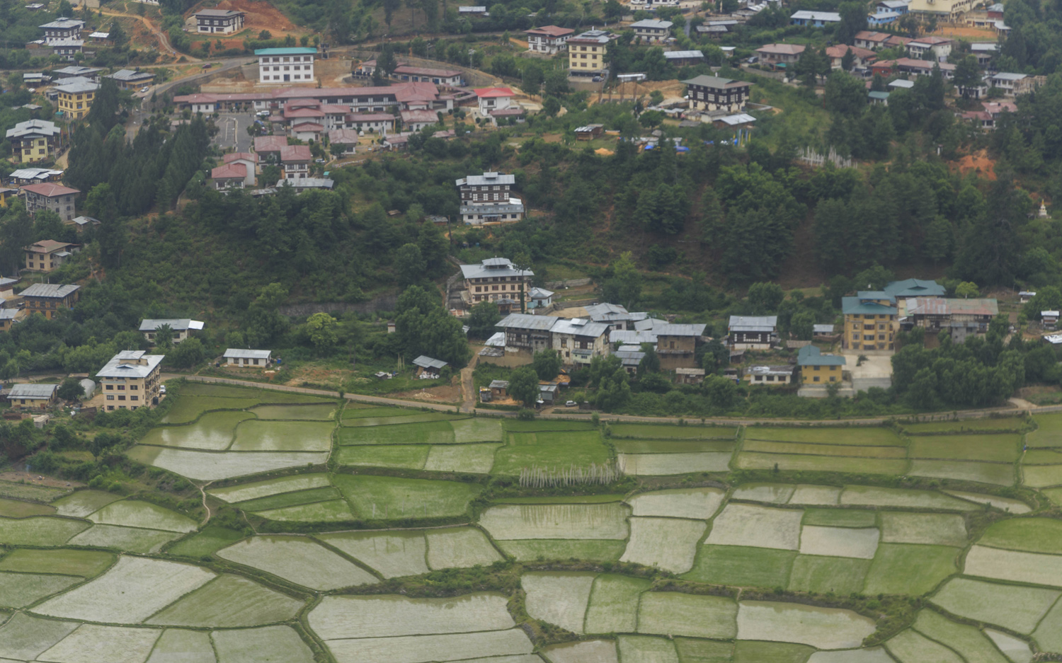 Az első megállónk a Pharo-i repülőtér végénél egy dombon volt, ahonnan beláttuk a környező rizsföldeket, a szemközti dombon levő Pharodzongot, és természetesen a szemtelenül kicsi repteret.