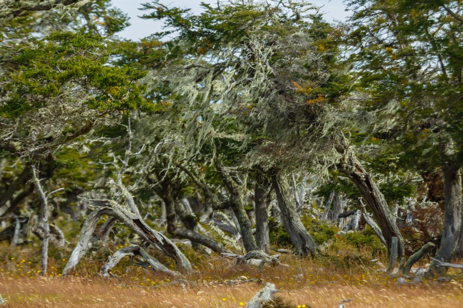 Ahogy tovább mentünk Puerto Natales irányába, a talaj hullámossága dombokká kezdett nőni, a pici bokrok nagyobbakká váltak, és megjelentek ismét a fák. Szélfútta, világos kérgű, csavarodott törzsű déli bükkök, amiknek ágairól szakálakként lógtak a kanadai zuzmók világoszöld fátylai. A néhány méter magas fák koronája nem zárt össze, köztük hullámzott az erős szélben a sárgás fű. Néhány vastagabb törzsű egyed kimagaslott a csoportból, és magányosan dacolt a viharos fuvallatokkal, mások már befejezték földi pályafutásukat, és a földre rogyva, szikár csontvázakként adták át magukat a természet megújító erejének.