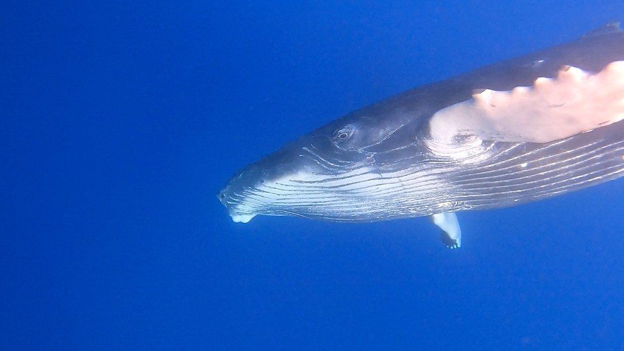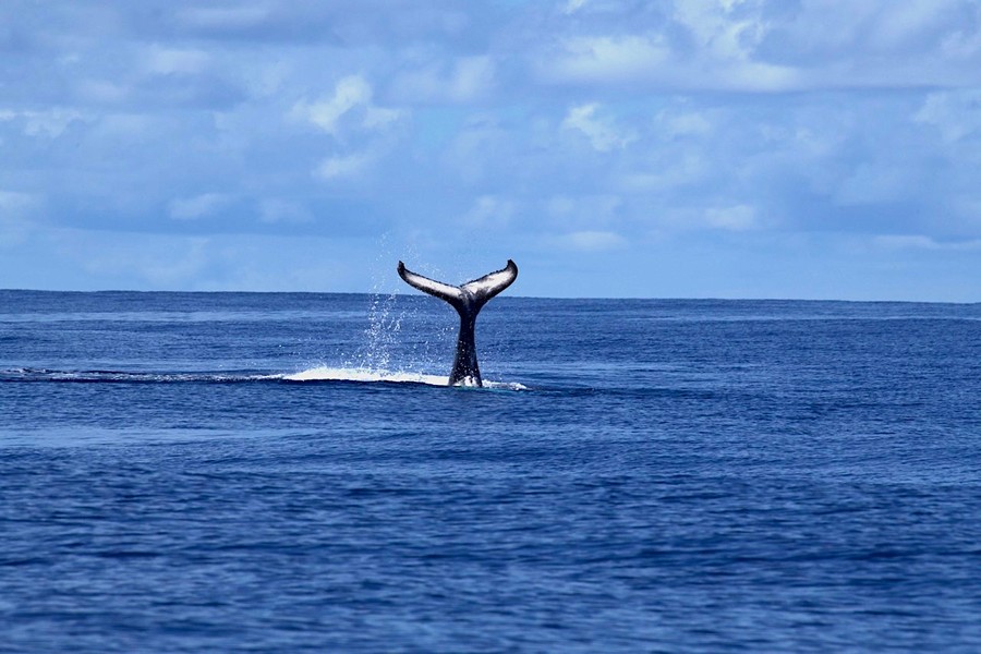 De van itt egy sokkal nagyobb látványosság, méghozzá a szaporodási időben errefelé hemzsegő hosszúszárnyú bálnák (Megaptera novaeangliae), pontosabban az a lehetőség, hogy a hatalmas emlősöket a víz alatt, természetes környezetükben figyelhetjük meg. Természetesen a bálnák megközelítésének megvannak a maga szigorú szabályai. A közelükbe érve, körülbelül száz méteres távolságból indulva úszunk a közelükbe, majd tőlük biztos távolságra, szigorúan a vízfelszínen maradva nézhetjük őket. Az utódneveléssel elfoglalt bálnák a vízfelszín alatt 10-20 méterrel lebegnek, de pár hónapos borjúk csintalan gyerekként le-fel úszkál és gyakran az őket szemlélő emberekhez is odaúszik. Hatalmas élmény ez, de a 6-7 méteres és közel egy tonnás állat egy nem jól úszó embert könnyen elsodorhat, így a szabály szerint ekkor hátrálni kéne. Könnyű ezt mondani, hiszen a bálna gyorsabban úszik, mint mi. Az esetleges cápatámadások elkerülése érdekében szigorú szabály, hogy folyamatosan kémleljük a vizet és ha cápát észlelünk, azt a vezetőnknek jelezve egy helyre úszunk és a hajót bevárva visszamegyünk annak fedélzetére. Csapattársaimmal ellentétben titkon remélem, hogy legalább egy méretes tigriscápával (Galeocerdo cuvier) találkozunk, ezért lelkesen kémlelem a mélységet. A mélységből visszaverődő napsütés vibráló fényei közül hirtelen előbukkanó cápa látványa egy pillanatra megdobogtatta a szívemet, de csak egy érdeklődő feketeúszójú szirtcápa úszott a közelünkbe, aki amilyen gyorsan érkezett úgy el is tűnt a nagy kékségben. De vajon mi vonzza ide a hosszúszárnyú bálnákat, hogy itt hozzák világra borjaikat? A déli féltekén élő bálnák táplálkozóhelyeiket elhagyva, hosszú, mintegy 6000 kilométeres útra indulnak, hogy 2-4 hónap múlva, júliusban ideérjenek. Az itt töltött hónapok alatt párzanak, illetve a vemhesen érkezett tehenek itt hozzák világra borjaikat és kezdik meg nevelésüket. A szigetvilág védett zátonyai, öblei és meleg tengervize biztonságos menedéket nyújtanak a hidegebb vizeken bálnaborjakra is vadászó kardszárnyú delfinek (Orcinus orca) csapatai elől. Amikor az anyatejen nevelkedő borjak már kellőképpen megerősödtek, akkor legkésőbb novemberig útra kelnek, hogy anyjukkal együtt térjenek vissza az Antarktisz hideg vizeire. Az Egyenlítőtől északra élő fajtársaik ugyanezt teszik, csak ők az Északi sark felé indulnak.
