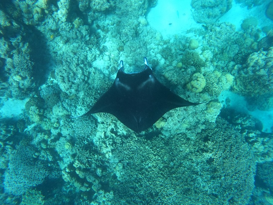 Első utunk a víz alá vezet. Mivel a polinézek a földkerekség legjobb hajósai, akik az oldaltstabilizált kenuikkal az Európa méretű szigetcsoport távoli részeire is elugrottak szomszédolni, ezért mi is egy hasonló felépítésű csónakba szállunk és egy félnapos keretében felkeressük a védett lagúna legszebb pontjait. Alig pár napja jártunk az igazgyöngy farmon, így az útitársak zöme gyöngyosztrigát szeretne találni. A légzőpipás, azaz sznorkelezős úszkálás során rá is lelünk egyre, de nyitogatni nem érdemes, mert a legtöbb francia polinéziai tengerparti szakasz és az ottani élővilág is védett. Ezek alapján a korallkertek meglátogatása és a búvárkodás is szigorú szabályok szerint történik, akárcsak a sasráják családjába (Myliobatidae) tartozó hatalmas ördögráják, köznapi nevükön manták (Mobula alfredi) megfigyelése. A hatalmas, gyakran 5 méteres úszófesztávolsággal bíró ráják bizonyos szigeteknél, így például Bora Bora zátonyának belső részén rendszeresen megfigyelhetőek. Kedvelt helyük az úgynevezett „tisztító állomás”, ami nem más, mint a tengerfenékről kiemelkedő sziklás, korallos rész, amely olyan kistestű halak élőhelye, amelyek előszeretettel fogyasztják a lassan úszó ráják bőrén megtelepedő élősködő parazitákat. Természetesen a rájákat nem csak ez, hanem a táplálékukat alkotó planktonokban gazdag vizek is idevonzzák. A lassan, méltóságteljesen és nyitott szájjal úszva táplálkozó mantákhoz lemerülni nem szabad, de nem is baj, hiszen az alattunk 5-10 méterre szinte “repülő” ráják mérete így fentről is jól érzékelhető.
