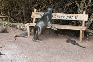 A Plaza-szigetek két tagja Santa Cruztól keletre találhatók. Mi ennek déli tagját keressük fel, hiszen a másik a látogatók elől elzárt, szigorúan védett területnek számít. A sziget felszínét egy kristályvirágféle, a Sesuvium és a fügekaktuszok erdei borítják. A rengeteg oroszlánfókát és a tengeri madarak költő kolóniáit leszámítva a sziget legérdekesebb zoológiai szenzációja, a szárazföldi életet élő varacskosfejű és a tengeri életmódhoz alkalmazkodott tengeri leguánokról hibridjei.